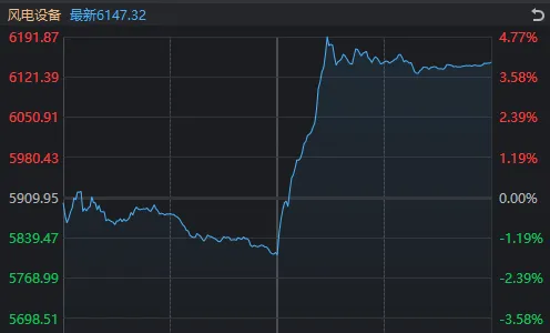 下午一开盘,原本跌超1%的风电设备板块,从水下急速拉升,半小时内最高涨幅达到4.77%。